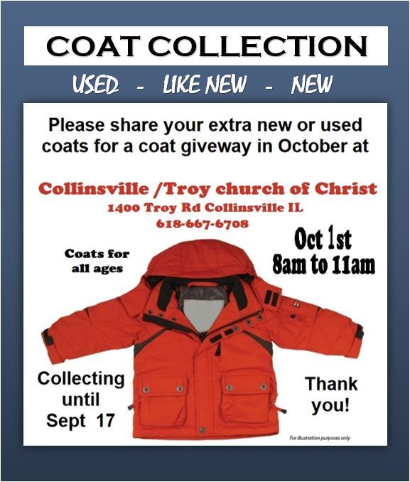 Posted on: September 6, 2022[ARCHIVED] Coat Collection (until9/17) & Give Away (10/1) - Troy- Collinsville Church of Christ